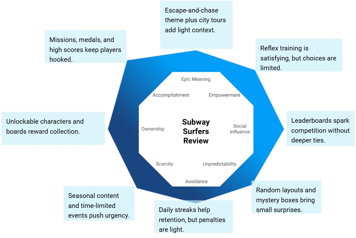 The Octalysis footprint of Subway Surfers leans heavily on Accomplishment, Ownership, and Social Influence, with light touches of scarcity to keep momentum. This balance fits perfectly for casual players who want short, skill-based runs with visible rewards.