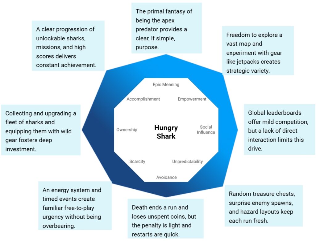 Today, I’ll be using Yu-kai Chou’s Octalysis Framework to break down the core drives that make Hungry Shark Evolution such an enduringly addictive mobile game. Let’s dive into what keeps players hooked on this underwater feeding frenzy.