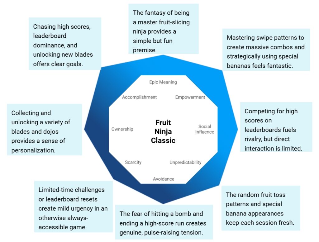 Today, I’ll be using Yu-kai Chou’s Octalysis Framework to analyze why Fruit Ninja Classic remains an incredibly satisfying and enduring mobile game years after its initial release.