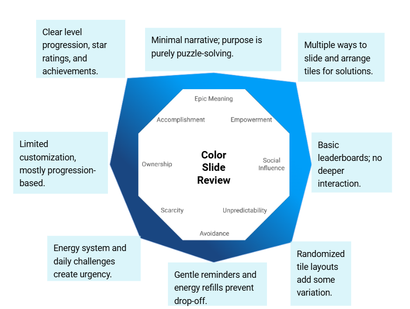 Color Slide’s Octalysis profile highlights Accomplishment and Empowerment as its strongest pillars, supported by light Scarcity mechanics. The game leans heavily on White Hat motivation—progress and mastery—while keeping stakes low.