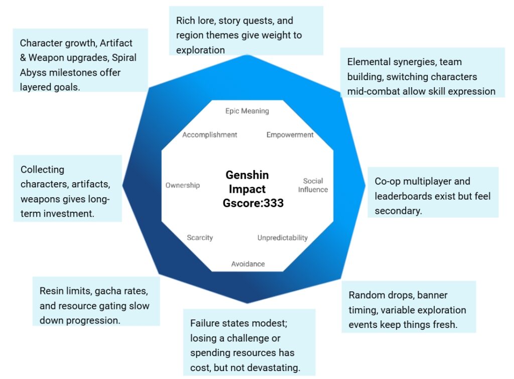 I’d recommend Genshin Impact to players who love sweeping open worlds, deep combat systems, and character progression. Its strengths lie in Meaning and Accomplishment—you feel rewarded for exploration and long-term growth. The weaker points are resource gating (especially for free players) and that social play is supportive rather than core. If you want an immersive fantasy RPG with frequent updates and rich visuals, it’s definitely worth playing.