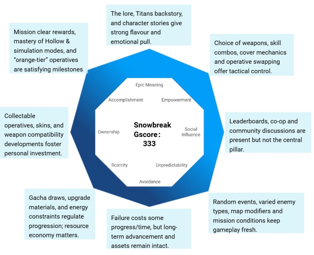 Scoring range: 1–10. Higher scores reflect stronger implementation of the core drive and greater player motivation.