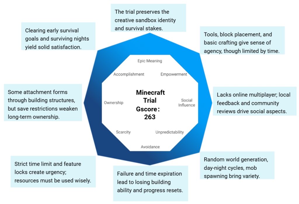 Minecraft Trial succeeds as a strong sample of the full sandbox experience, highlighting what makes the game beloved: creativity, survival, world exploration. Its biggest strengths are Accomplishment and Scarcity—the time-limited challenges make every minute count. Weaknesses lie in Ownership (worlds not persistent) and Social Influence (limited multiplayer). Recommended for those curious about Minecraft who want to test it without purchase. If you enjoy building and persistence, the full version delivers much more.