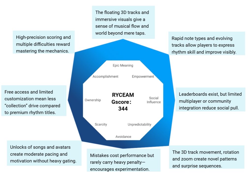RYCEAM excels in Accomplishment and Unpredictability, offering rhythm fans a fresh spin on the genre with 3D tracks and precise controls. However, less emphasis on social features or deep progression systems means it’s best suited for self-motivated players.