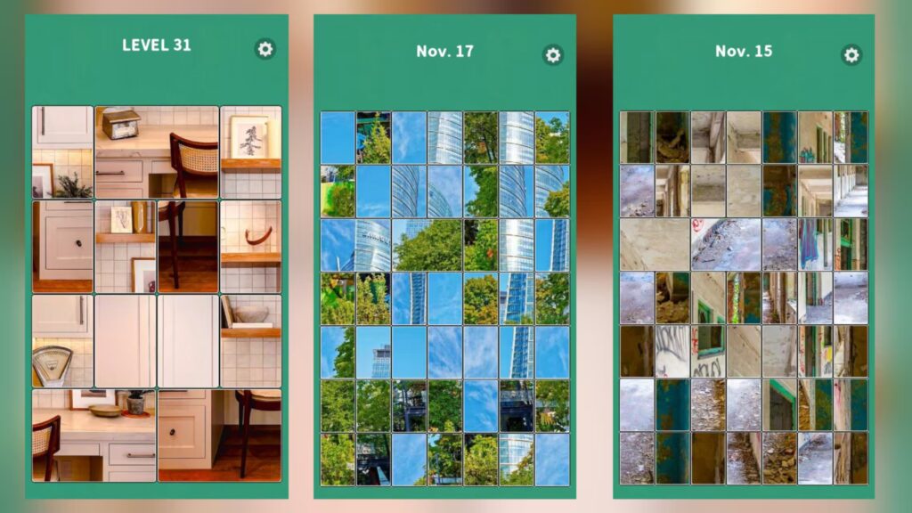 The puzzle piece arrangements and card layouts in each level are randomized, providing basic replay value and a sense of the unknown.
