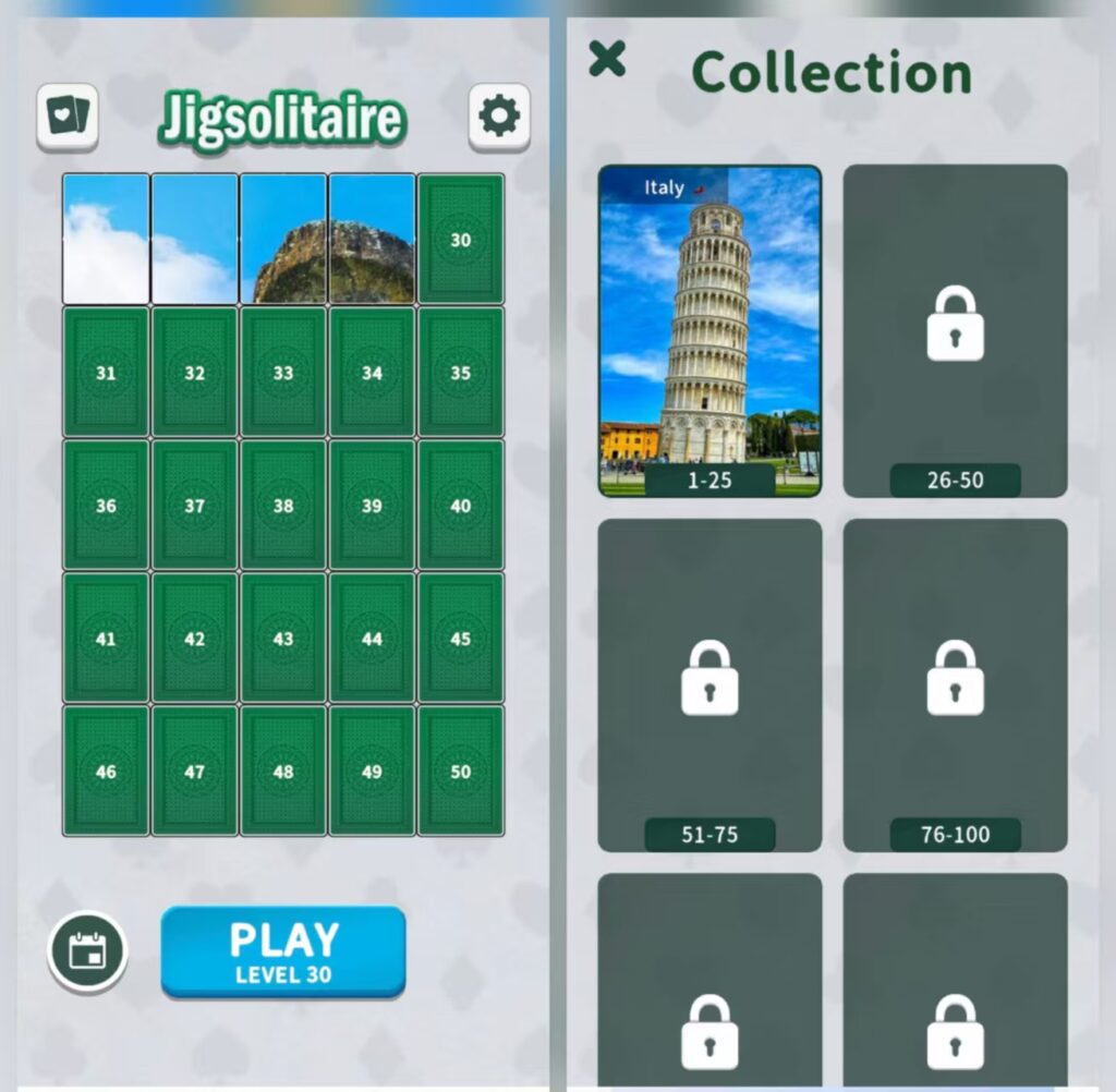 The game sets a goal through themed collections like “Italy” but lacks any story, characters, or world-building. The “Collection” is just static images with no emotional connection.
