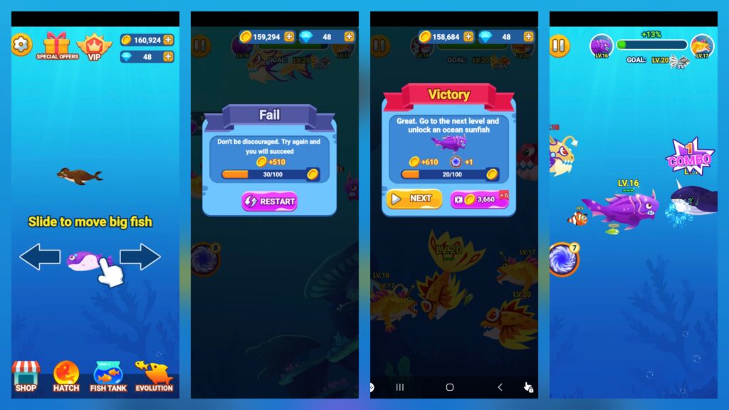 - Visual Evolution: Your fish has clear levels (Lv.10, Lv.20). Every upgrade and evolution (e.g., from “Guppy” to “Tabby”) brings visible changes in form and increased power, providing direct feedback.