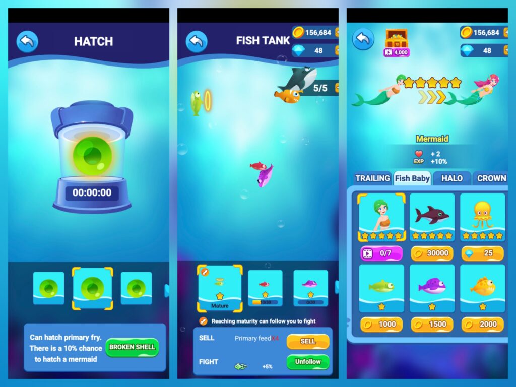 The hatching system is the source of surprise! Players have a chance (e.g., 10%) to hatch rare fish like the Mermaid. Each new level presents different schools of fish and Bosses, making you curious about what’s next. What will the next evolution of your fish look like? What rich rewards await after defeating a Boss’s “summoned fish wave”?